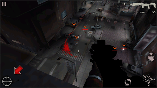 1、下载安装好杀手2影子阴谋手机版,游戏开始我们将身处天台上,并在一个掩护的状态。点击右侧的盾牌箭头图标,主角将站起离开掩护。