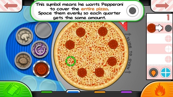 在Papa's Pizzeria,顾客会订购切成四块、六块或八块的披萨。要切片比萨饼,玩家必须在比萨饼上拖动鼠标(或滑动手指)以确定比萨饼切片机在比萨饼上的路径。如果切的片数不正确,或者片大片小,则在将披萨呈现给顾客时将被扣分。