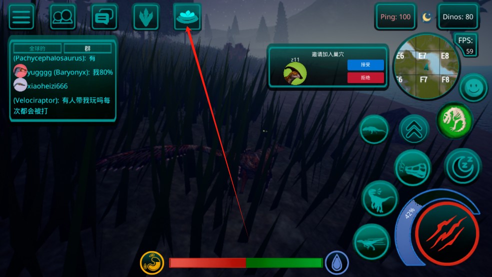 7、建造巢穴,养育恐龙蛋,并邀请服务器上的其他玩家加入你的巢穴(家庭)。注意,你的恐龙必须完全成长且账户达到5级或以上才能使用此功能。