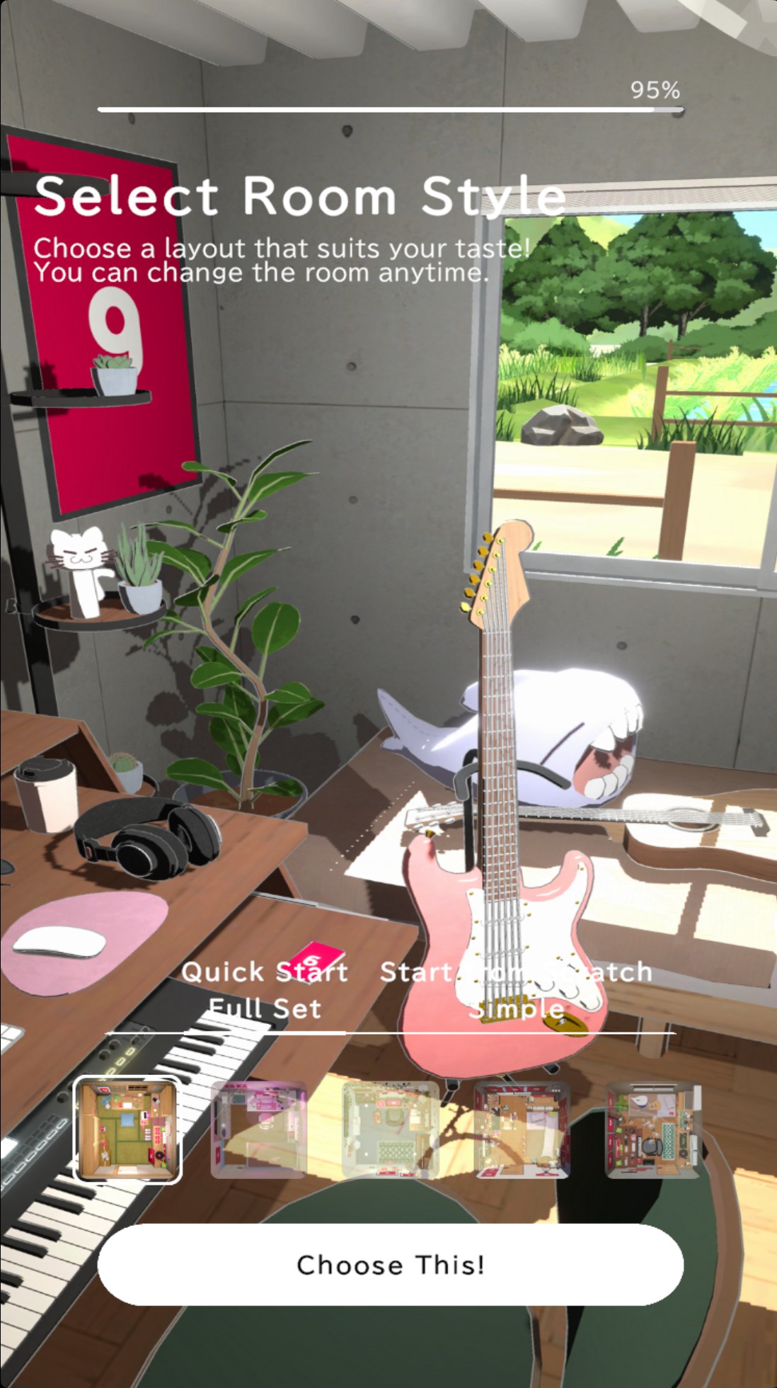 3、接下来,从五种不同风格的房间中挑选一个喜欢的场景,正式进入游戏后,你会看到角色正静坐在桌前。