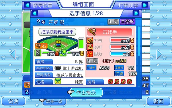 玩家需要扮演一位棒球队的经理,进行棒球队的管理经营;你需要制定训练计划,招募合适的队员,进行训练和比赛安排等,全面掌控球队的发展;