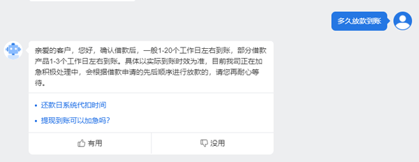 根据官方客服回复页面显示:用户在app上确认借款后,一般1-20个工作日左右到账,部分借款产品1-3个工作日左右到账