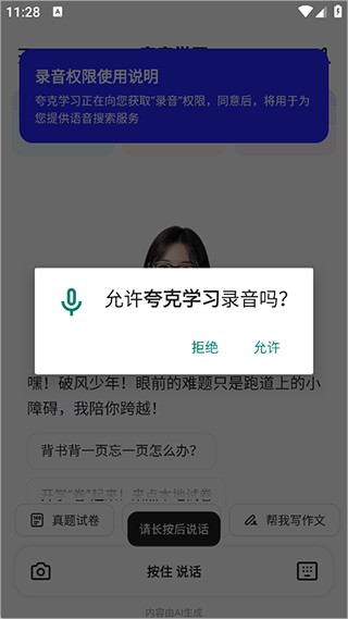 3、接着就可以长按说话按钮,将学习的疑问说给它听