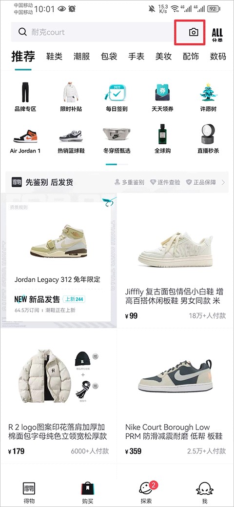 1、打开得物,在购买界面中点击搜索框后面的相机按钮