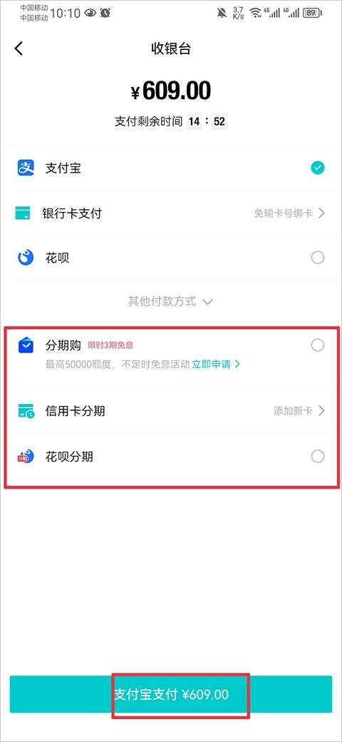 3、最后在支付的时候选择分期购、信用卡分期、还是花呗分期进行付款即可
