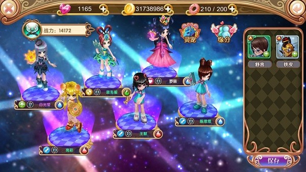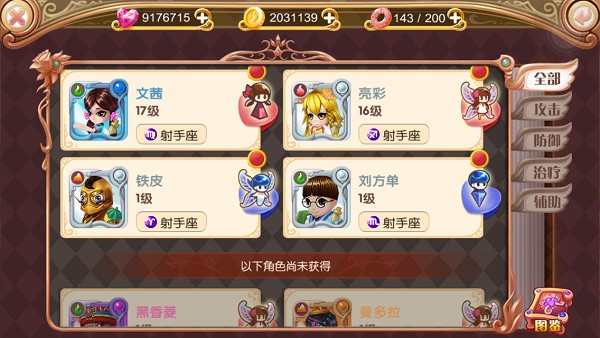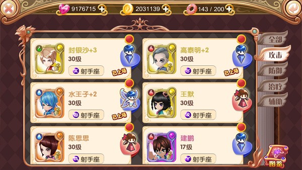 通过界面右侧标签可知,叶罗丽手游根据四种职业定位对角色们进行了分类,分别是攻击、防御、治疗、辅助