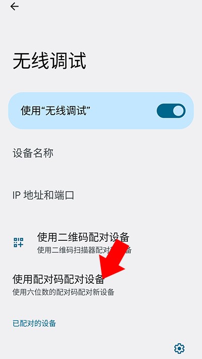 5、点按“无线调试”中的“使用配对码配对设备”,然后我们记住六位数的配对码