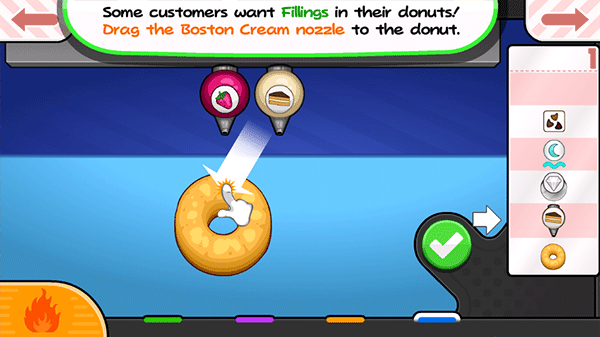 这是比较关键的一步,玩家的甜甜圈需要油炸之后才可以出炉,具体的油炸程度可以看炉子中的计量槽,计量槽颜色越深则甜甜圈越接近深色则表示甜甜圈接近完成,尤其需要注意的甜甜圈有两面,一定要两面都炸过才行,另外还要牢记不能炸太久。
