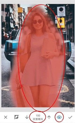 7、进入蒙版后,注意看参数。此时双重爆光的参数,是100,用画笔在图片上进行涂抹后,涂抹了的区域就显示了人物了。说明当我们用双重曝光数值100去涂抹图片时,图片就会显示后面添加的人物图片,反之如果双重曝光参数为0时再去涂抹,那么图片就会再次显示背景为车的效果。