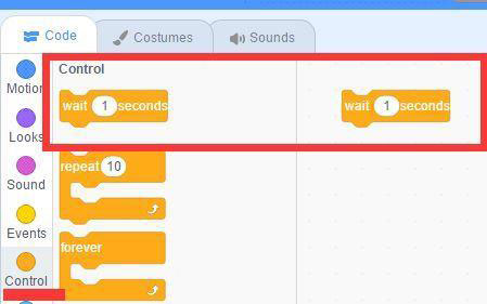 3、拖动 【Control】积木区的【wait 1 seconds】,可让程序暂停1秒;