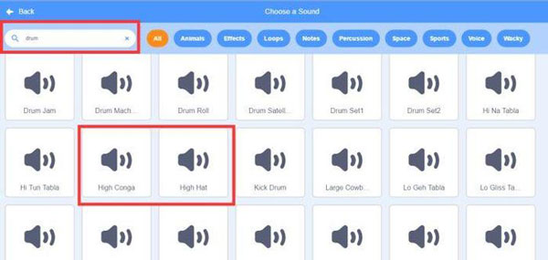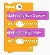 4、然后在程序区,将几个积木组合在一起,创建鼓声,如图;