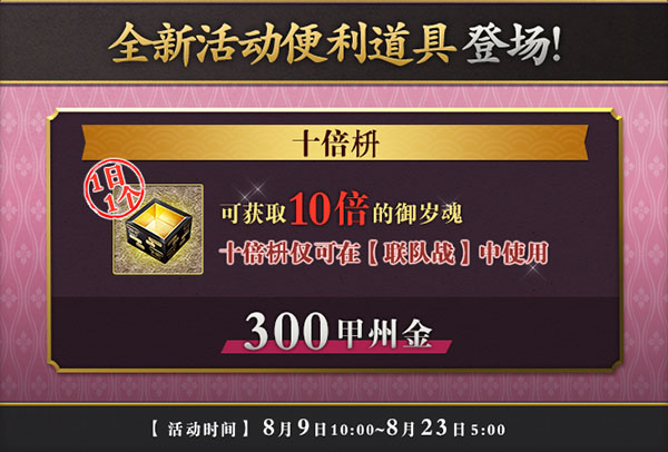 在确认出阵前,若审神者选择使用便利道具【三倍枡】,则本轮出阵结束后将获得三倍的【御岁魂】;若审神者选择使用本次联队战新增便利道具【十倍枡】,则本轮出阵结束后将获得十倍的【御岁魂】。