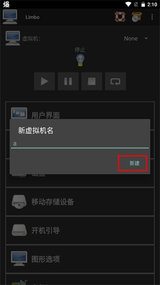 5、在弹出的窗口里填写自己新建的虚拟机配置的名字,名字可以随意,不过建议简单点,同时最好是英文;这里用a示例。填写完以后,点窗口右下角的“新建”。
