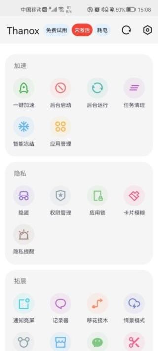 1、下载并进入Thanox权限管理软件,在正式进入软件之前我们需要了解软件的大体功能模式,首先就是激活模式,不同的模式用户可探索的功能是不一样的。