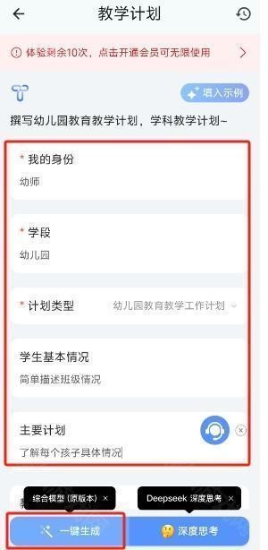 2、点击“教学计划”,输入身份、学段以及计划类型等信息,找到页面上的“一键生成”