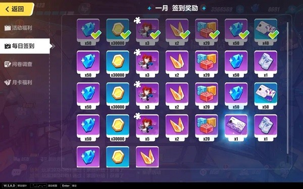 4、福利:不太常用的选项,包括签到,月卡,祈愿等。但是因为每天第一次登陆游戏的时候会自动弹出签到和月卡福利,所以很多萌新甚至不知道它的存在。