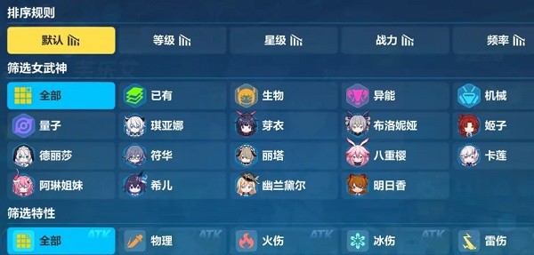 这里的黄色小漏斗是筛选功能,可以提供多种排序,筛选功能,帮助萌新从老婆们当中快速找到需要的。