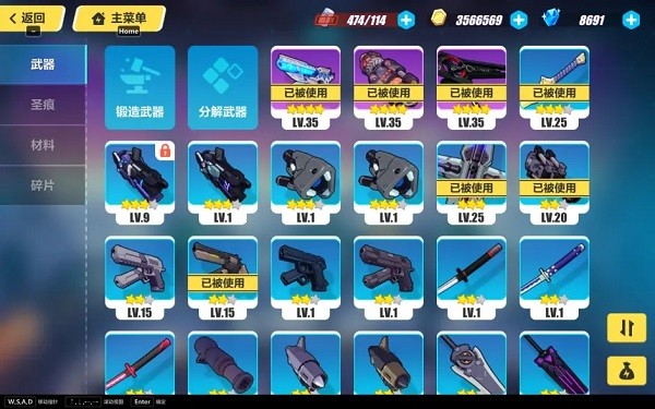 在这里查看已有的武器和圣痕,以及分解和锻造功能,圣痕页功能相通。材料中包含各种游戏资源和活动材料等,碎片包括女武神碎片和悬赏装备碎片。