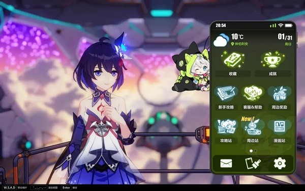 后崩坏书的主页面,萌新推荐这张地图的原因是试用独立的剧情角色,可以解决萌新初期自己阵容较弱的问题(樱色和天命需要使用自己的角色)。另外奖励比较丰厚,下排黄色地球选项通往地图选择页面。