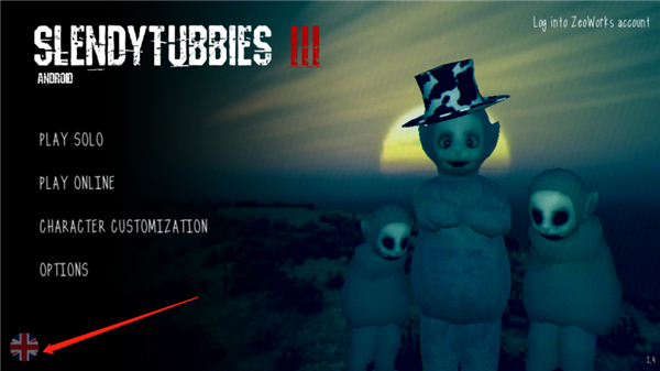 1、由于鬼畜天线宝宝3本身是英文简体,因此我们第一次进入游戏点击左下角的图标;