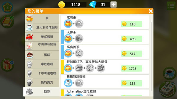 觉个例子来说明一下,设备分为6个组:饮料(比如:茶)、冰箱(比如:牛奶)、香料(比如:柠檬)、冰淇淋(比如:香草)、糖浆(比如:巧克力糖浆)和蛋糕(比如:甜甜圈)。在游戏里,我们的咖啡店员工制作菜肴时所走的路径的各个连接点是根据不同组中选择的临近原料进行计算的。设备相互之间的联系真的比较重要: