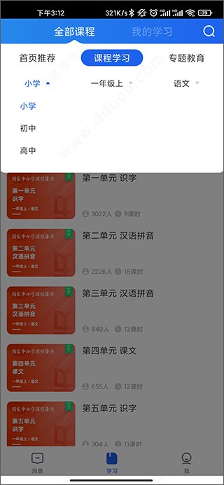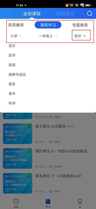3、同时点击“课堂学习”主要就是提供了小学、初中、高中所有年级所有学科的免费网课;