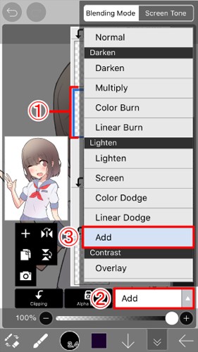 点击图层1使添加的图层成为当前图层。然后点击"添加"以打开步骤2的混合模式菜单。最后选择步骤3在 "混合" 菜单中添加。
