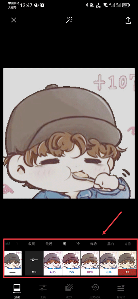 4、在图片编辑界面你可以先挑选自己喜欢的滤镜,滤镜分为暖、冷、鲜艳、黑白、自然等多个类型