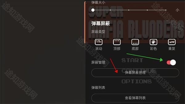 在右侧弹出的弹幕设置页面中,开启弹幕屏幕管理(下图绿色箭头所指),并点击【弹幕屏蔽管理】(下图红色箭头所指)