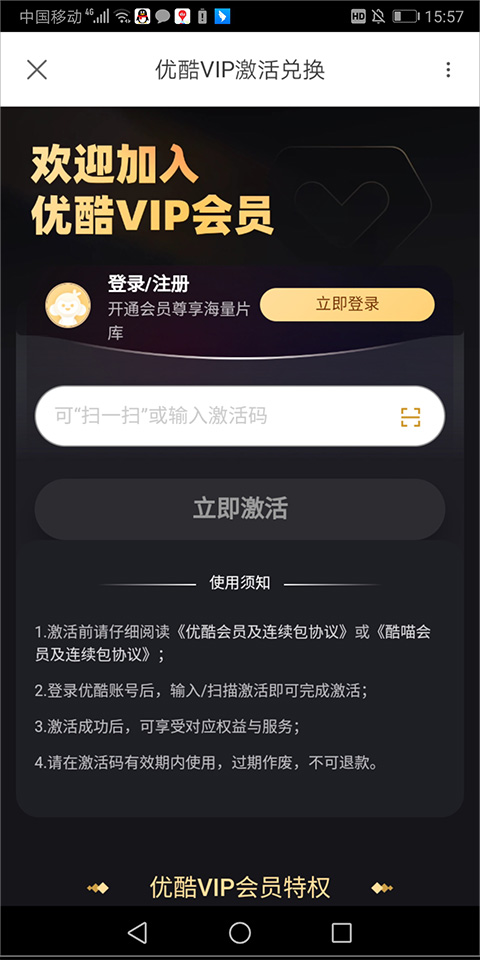 输入会员卡号后点击【立即激活】即可享受会员权益