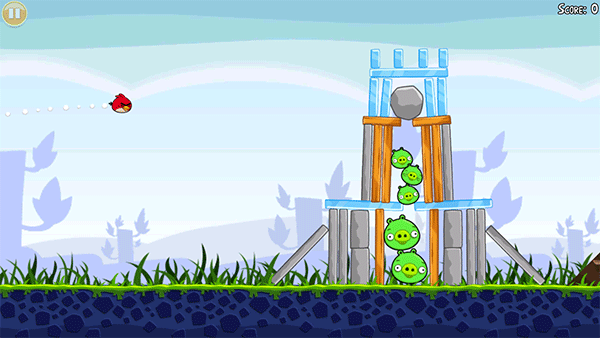 (鸟儿的弹出角度和力度由你的手指来控制——鼠标按住小鸟不放即可控制方向、力度;要注意考虑好力度和角度的综合计算,这样才能更准确的砸到肥猪。而被弹出的鸟儿会留下弹射轨迹,可供参考角度和力度的调整;)