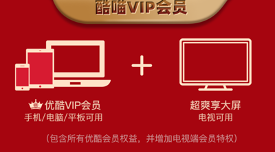 (3)酷喵VIP :除了包含优酷VIP权益外, 还支持在电视端CIBN酷喵影视,天猫魔盒,天猫魔屏上使用。