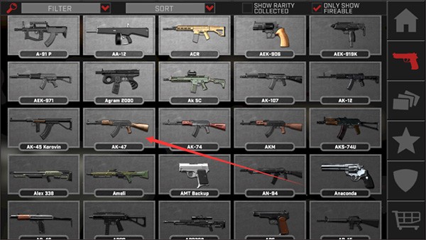 2、在枪械库中您可以看到各种各样的枪械,手枪、步枪、狙击枪应有尽有,你还有按照分类挑选,选择您感兴趣的枪械点击进入;