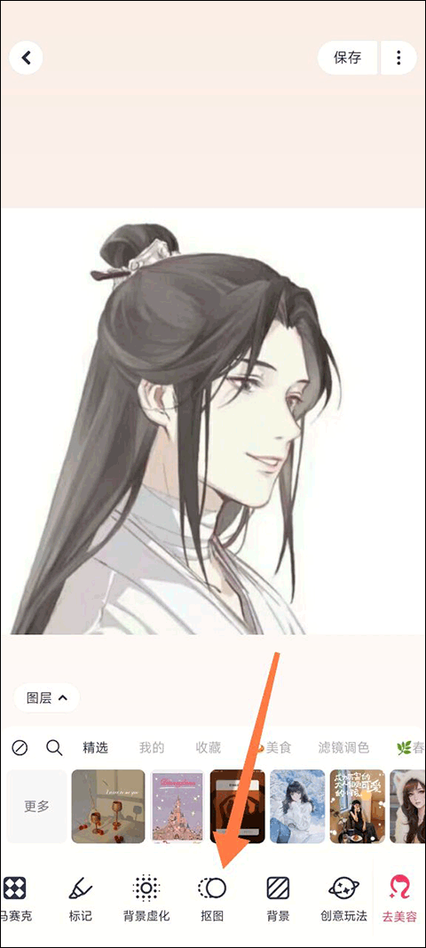 选择好自己想要抠图的图片后我们会进入到现在这个图片编辑界面,在我们的底部有一排功能,这些功能都是提供给大家进行图片修改的,我们在这么多功能中找到抠图功能然后点击它。