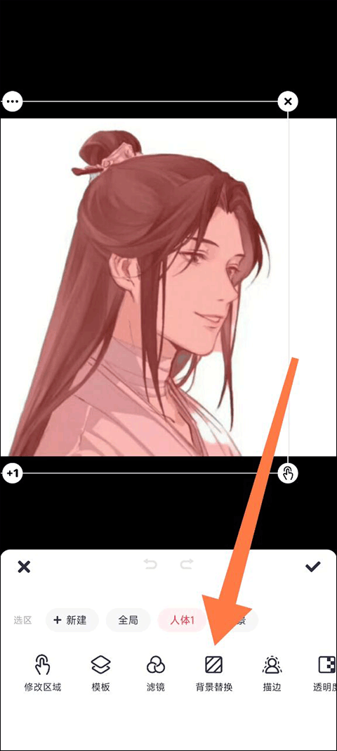 点击以后应用就智能的解析出了图片中的元素,能够看见小编放上去的图片解析出了一个人体元素一个背景元素,我们点击一下人体元素那么人体元素都会闪烁一次红光,这样代表着我们选中了这个元素,这个时候是不是感觉这个图片白色的背景太过于单调了?这个时候我们点击底部的背景替换。