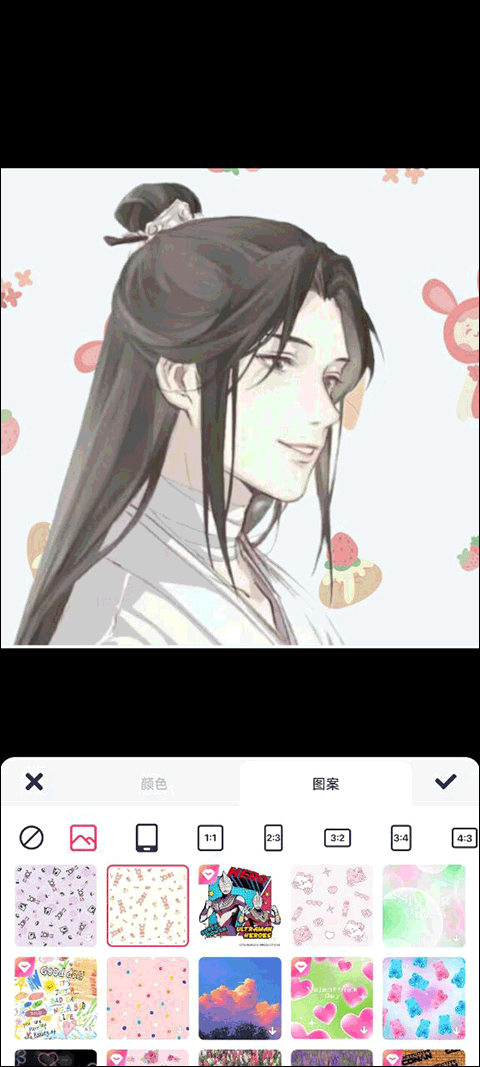 然后可以看见美图秀秀中非常丰富的背景图案素材,我们选择一个喜欢的背景,可以看见图片的背景一下子就变了,但我们选中的人体没有任何变化。调整好了直接点击这个对勾就可以了。