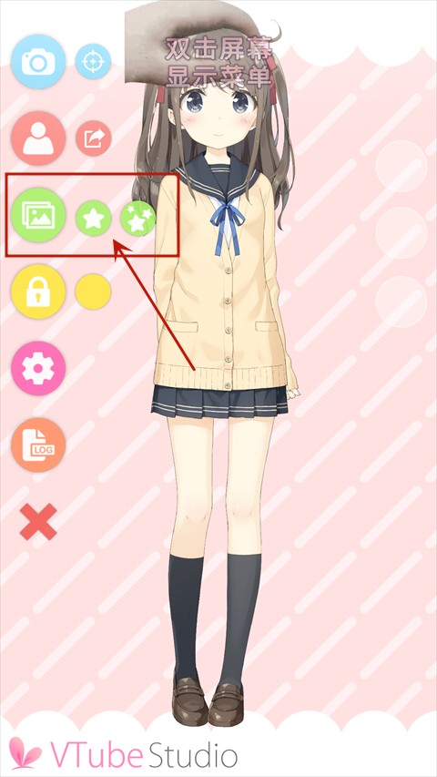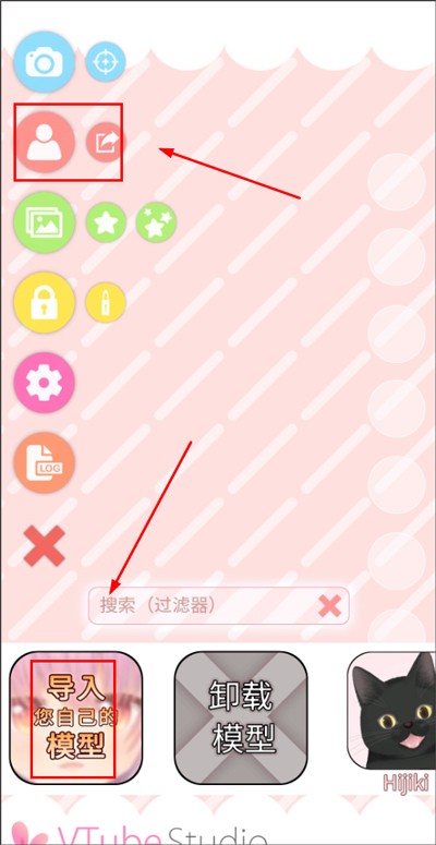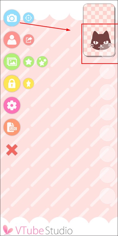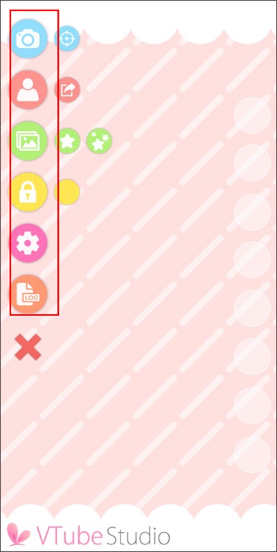 1、打开VTube Studio,左侧分布着软件的主要功能。从上到下分别为:拍照、导入模型、背景、位置锁定、设置、记录以及图标隐藏。