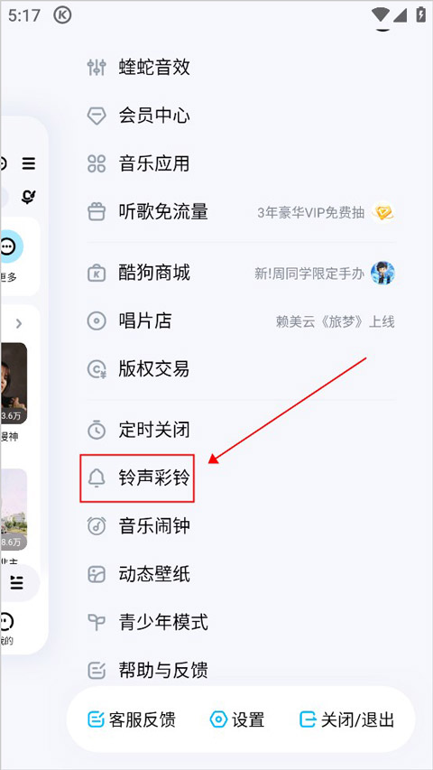 1、打开酷狗音乐播放器,点击右上角的下拉菜单,找到“铃声彩铃”。