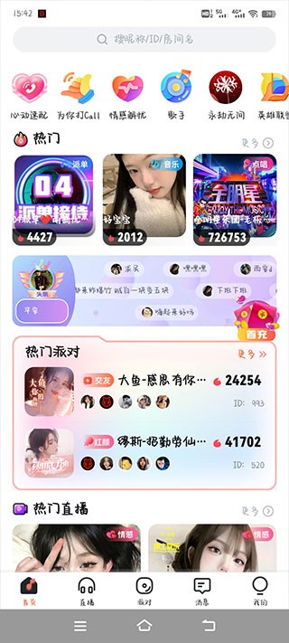 2、首页顶部可以快捷进入不同主题的语音聊天室、热门派对以及直播页面。