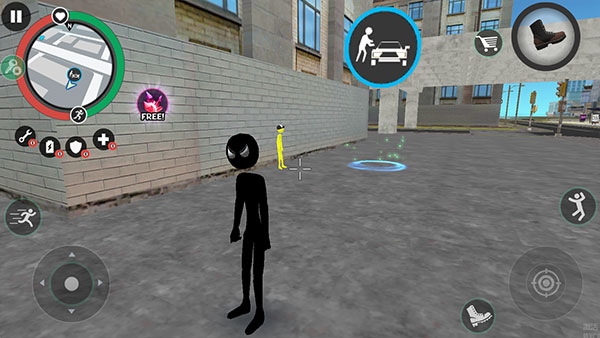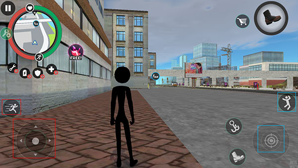 5、点击左侧的摇杆可以控制火柴人进行移动,点击右侧的钩子可以化身蜘蛛侠自由穿梭,点击“人”的图标可以跳跃,点击瞄准镜图标可以进行攻击。