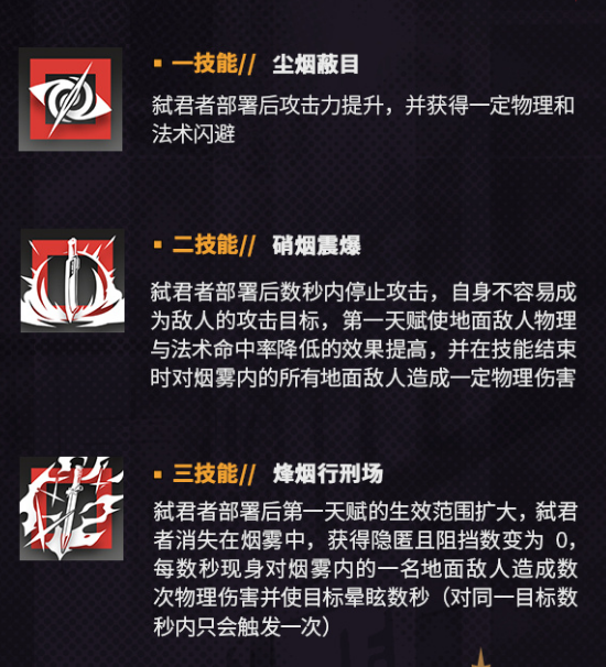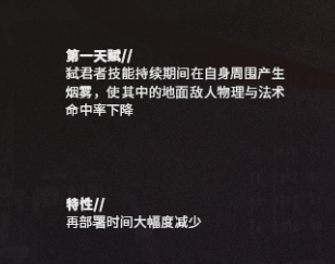 弑君者部署后数秒内停止攻击,自身不容易成为敌人的攻击目标,第一天赋使地面敌人物理与法术命中率降低的效果提高,并在技能结束时对烟雾内的所有地面敌人造成一定物理伤害
