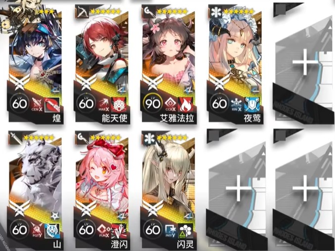 需求干员:煌(地面输出+阻挡)、山(阻挡+输出)、能天使、澄闪、艾雅法拉(高台输出)闪灵(医疗)、夜莺(群奶)
