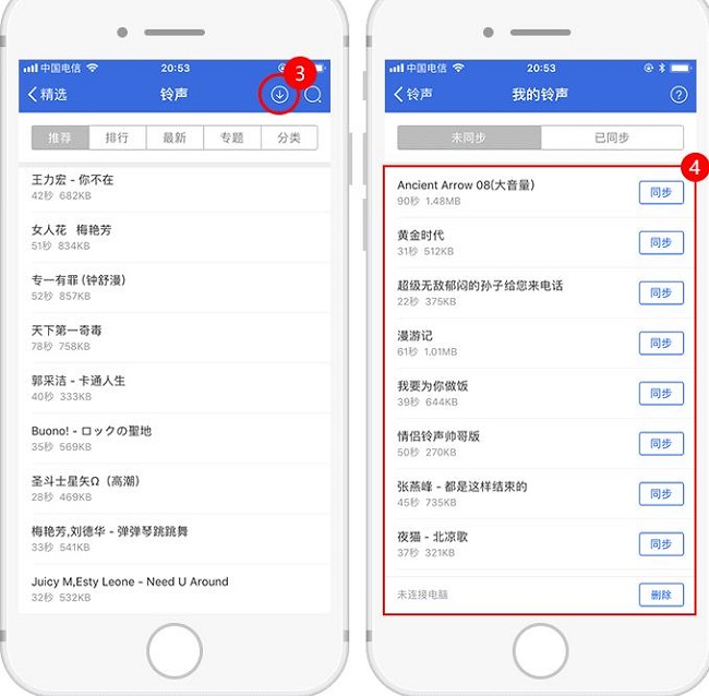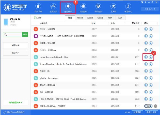 方法2:使用“爱思助手PC端”下载并导入铃声1、打开爱思助手PC端,将设备连接到电脑,在“酷炫铃声”资源中,点击铃声右边的下载按钮,下载该铃声并导入到设备中