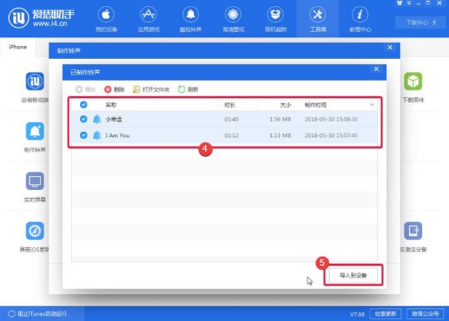 方法3:使用爱思助手PC端制作并导入铃声1、打开爱思助手PC端,将设备连接到电脑,点“工具箱