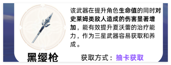 该武器在提升角色生命值的同时对史莱姆类敌人造成的伤害显著增加,能有效提升夏沃蕾的治疗能力,作为三星武器容易获取和养成。