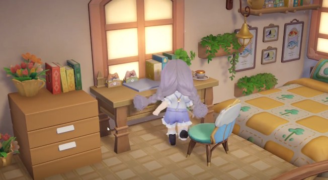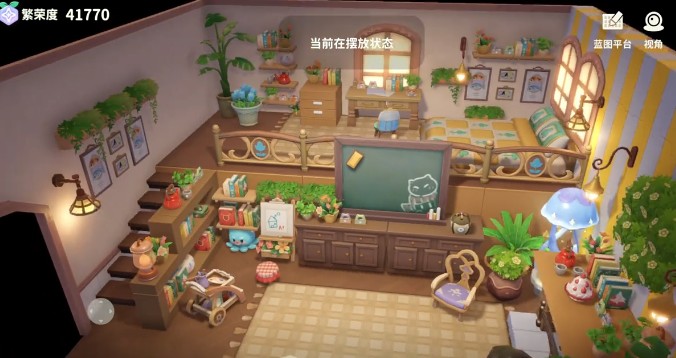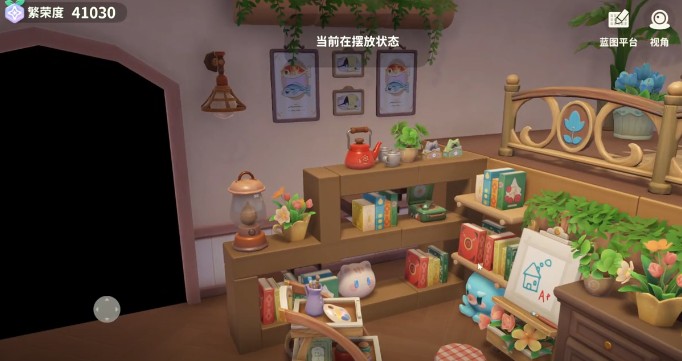 沿着楼梯直接进入到第2层,这里是一个小书桌的区域,还有卧室。书桌上的纸张,还有边上的柜子,全部都是亲手制作的,在游戏中手搓的功能真的是超级方便,无论是想要什么样的装饰或者是家具都可以自己diy做出来。所有的一切都可以尽情发挥自己的想象,打造一个专属的空间。