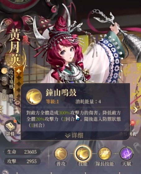 在“鼓”形态下,黄月英的普通攻击是“振鼓”,它不仅会对敌人造成伤害,还能让她进入一种防御状态,持续数回合。这一机制非常适合她在战斗中充当一个前排坦克角色,让她在输出的同时也能承受伤害,保护队友。她的队长技“累累如鼓”同样非常强大,在战斗开始时就能让敌方全体的攻击力降低,令敌人输出大幅削弱,为我方提供了一个很好的先手优势。