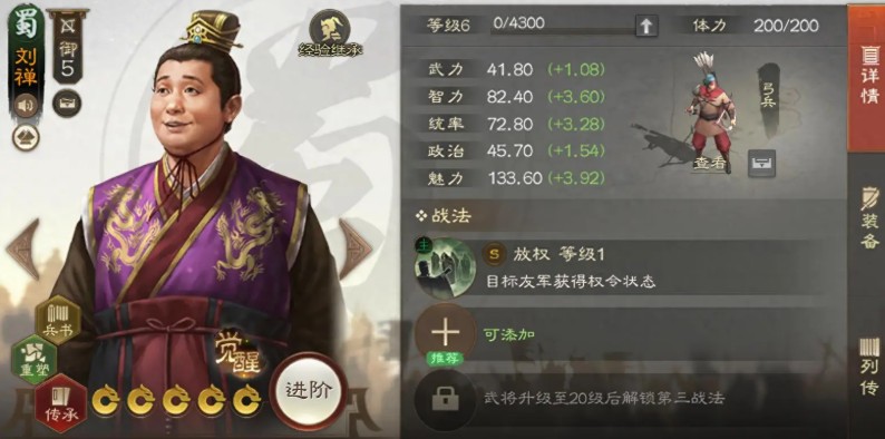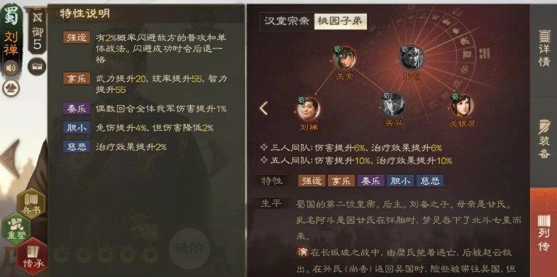 刘禅的特性“强运”和“享乐”赋予了他与众不同的优势。“强运”让他拥有一定概率避开敌人的致命攻击,而“享乐”则显著提升了他的武力、统率和智力,全面增强了他的战斗力。得益于这两大特性,刘禅的各项属性提升后变得十分均衡,他不仅能够在前线扛住压力,还能通过增强智力和统率有效支援后方队友。