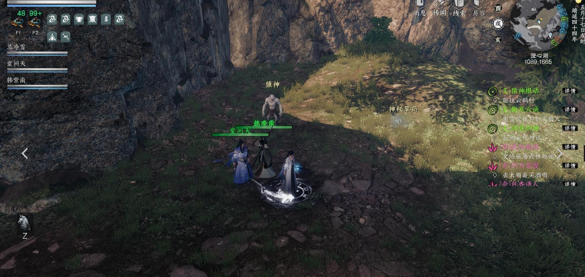 任务触发点在澄心湖坐标1082,1660。按M键打开大地图,左上角输入坐标点击定位,黄色标记点即为目标。到达后可见湖边圆形石台,猿神站在石台北侧,周围有三棵垂柳与荷叶漂浮的湖面,环境特征明显。无需前置条件或道具,到达即可触发。进入棋局后鼠标左键点击棋盘交叉点落子,右键取消选中,胜负遵循围棋围地规则。第一次对决猿神抢占左下角和右上角,建议控制右下角、第二次侧重中腹争夺,需保持棋子连接、第三次注意应对弃子战术,避免被分割包围。若棋艺不足,可通过“认输”操作积累棋艺值后再挑战。