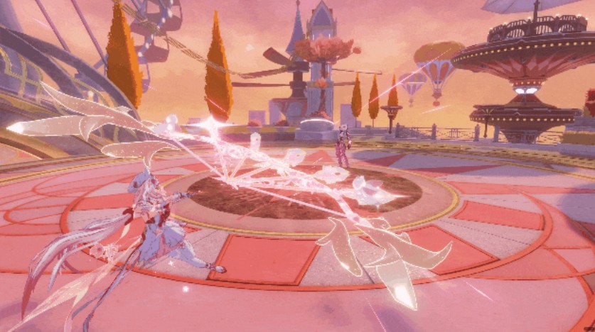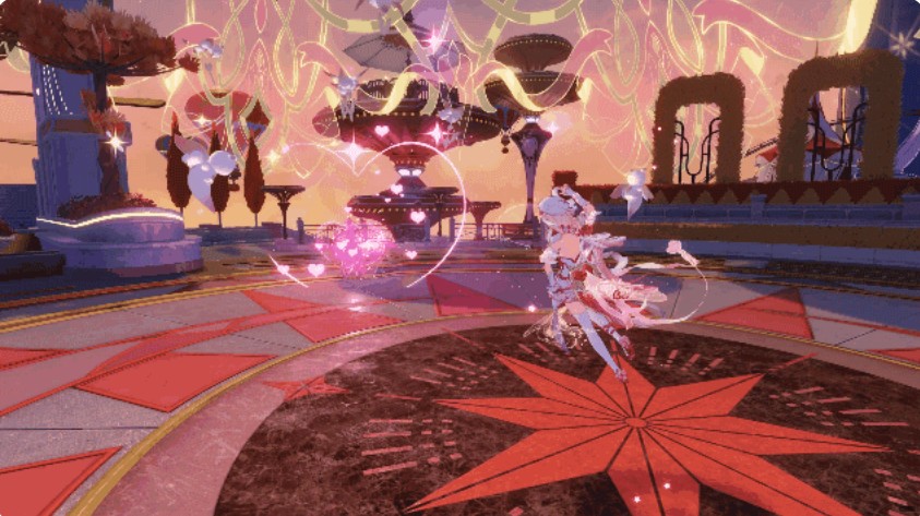 使用武器技能时,爱莉希雅会召唤“爱愿之花”进行攻击。再次使用该技能可发动“心蕊初绽”,使花簇进入绽放状态,并留下心形花丛。当技能等级达到最高阶“胜春”,或通过必杀技一次性释放7根箭羽后,即可触发必杀连携,对敌人造成巨额冰冻元素伤害。